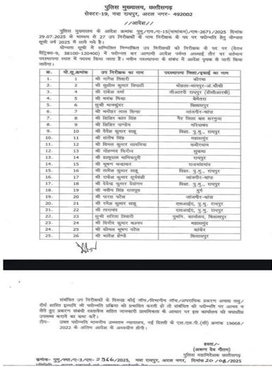 रायपुर : छत्तीसगढ़ पुलिस के 25 उप निरीक्षकों (SI) को पदोन्नति का तोहफ़ा मिला है। इन्हें वर्ष 2025 की योग्यता सूची के आधार पर निरीक्षक (TI) के पद पर पदोन्नत किया गया है। इस संबंध में पुलिस महानिदेशक (DGP) अरुण देव गौतम ने आदेश जारी किया है।