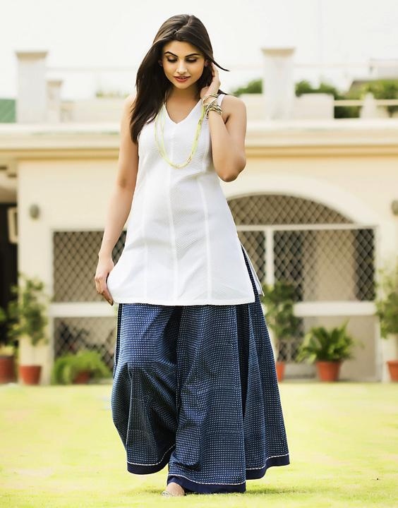कंफर्ट के साथ स्टाइल चाहती हैं तो अपनी कुर्ती के साथ पलाजों को पेयर करें। फ्लोई पलाजो के साथ कुर्ती गर्मियों के लिए सहज और ट्रेंडी विकल्प है। इसके साथ मिनिमल ज्वेलरी पेयर करें।
